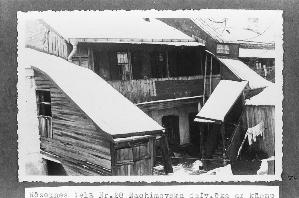 Daugavpils atjaunojamo un nojaucamo būvju skati. Nahimovska dzīvojamā ēka ar kāpnēm, fasādei pieguļošu nojumi un piebūvēm Rēzeknes ielā 28.
