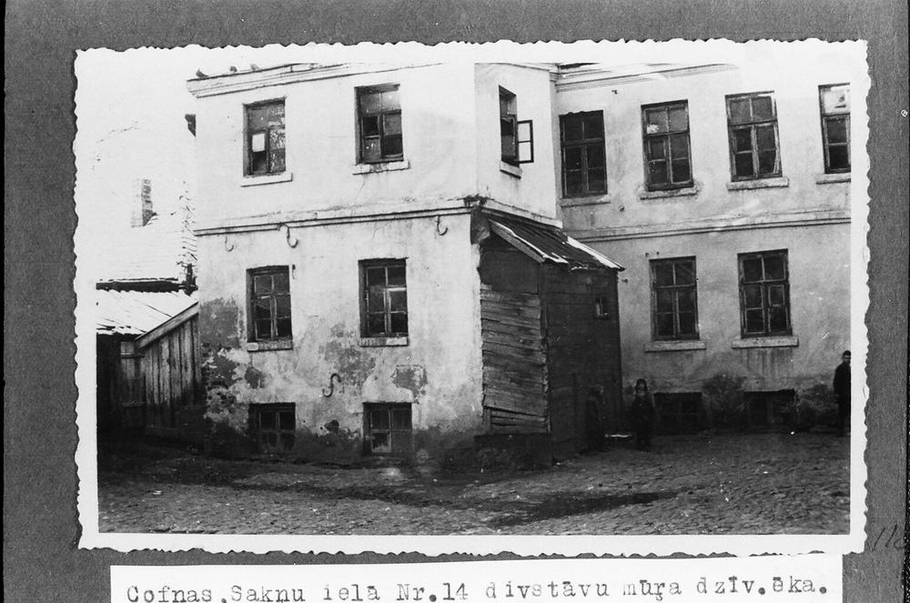 Daugavpils atjaunojamo un nojaucamo būvju skati. Cofnas divstāvu mūra dzīvojamā ēka Sakņu ielā 14.