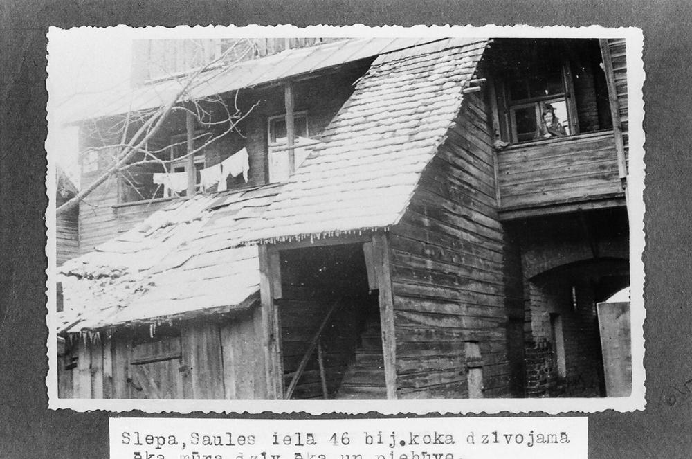 Daugavpils atjaunojamo un nojaucamo būvju skati. Slepa mūra dzīvojamā ēka ar slēgtu kāpņu telpu un koka piebūvēm Saules ielā 46.