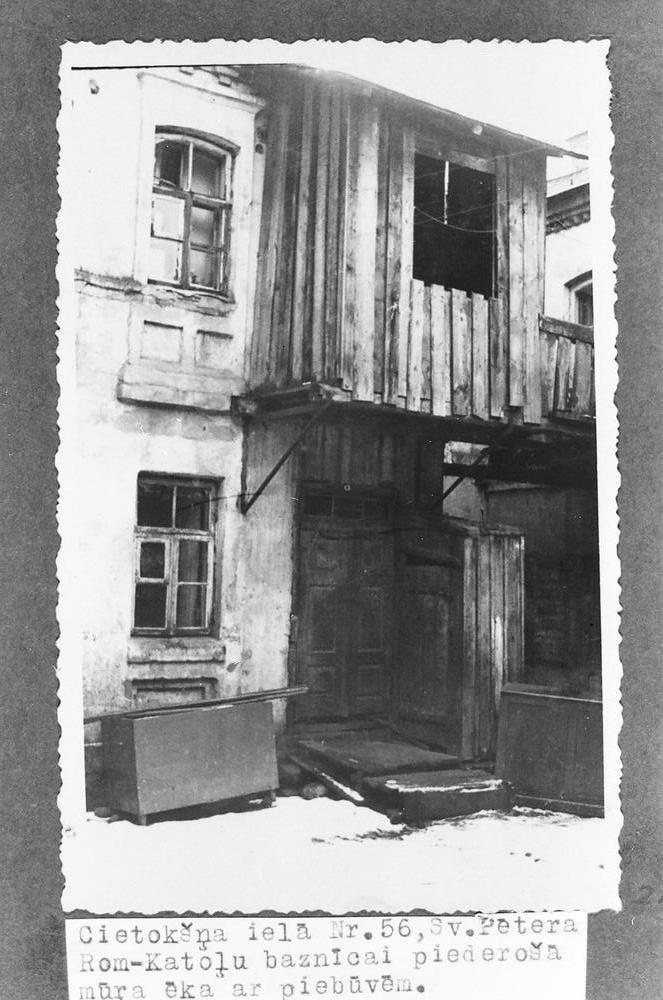 Daugavpils atjaunojamo un nojaucamo būvju skati. Daugavpils Svētā Pētera ķēdēs Romas katoļu baznīcas īpašumā esošā mūra ēka ar lieveni un piebūvēm Cietokšņa ielā 56.