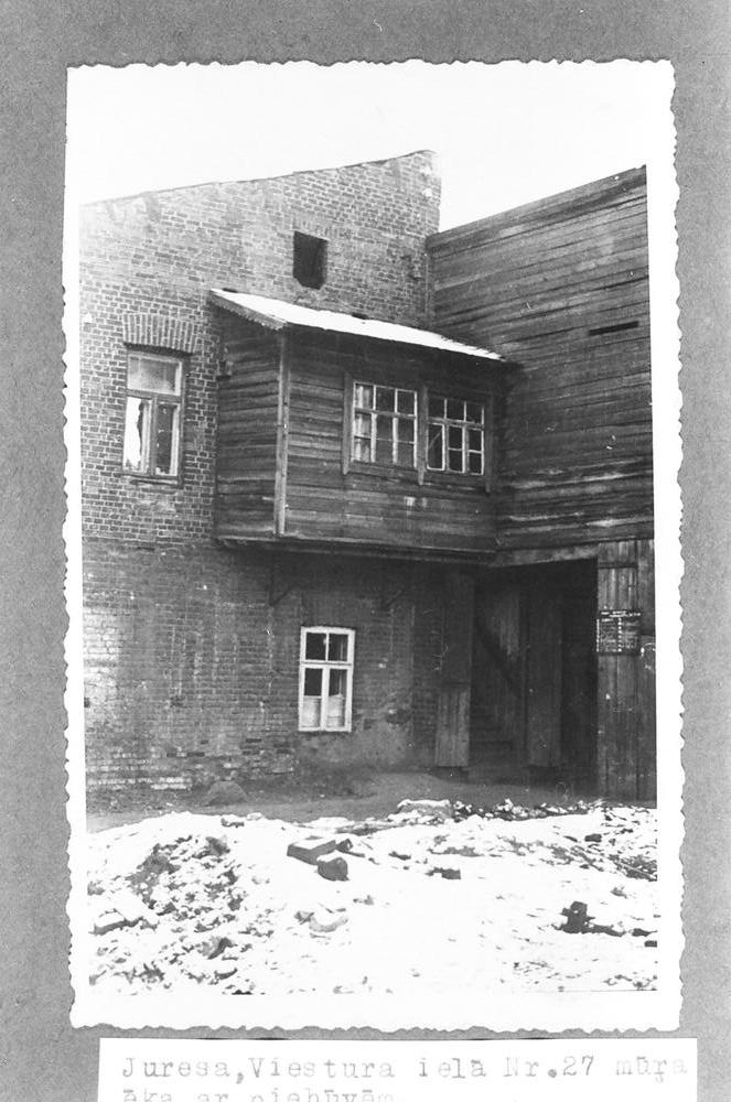 Daugavpils atjaunojamo un nojaucamo būvju skati. Juresa mūra ēka ar koka piebūvi pie ēkas fasādes Viestura ielā 27.