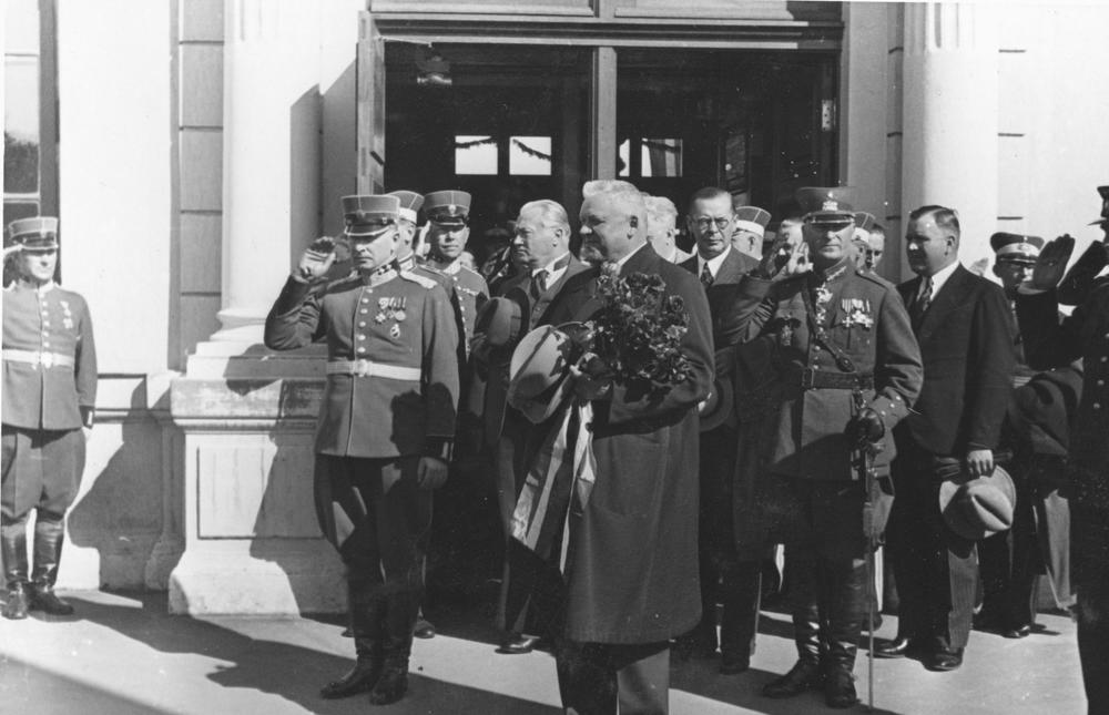 Latvijas Valsts un Ministru prezidenta Kārļa Ulmaņa un valdības pārstāvju vizīte Liepājā, par godu Latvijas Pagaidu valdības ierašanās 18. gadadienai. Viesu sagaidīšana Liepājas dzelzceļa stacijā. Priekšplānā Kārlis Ulmanis. 1. rindā no kreisās: 1. Liepājas pilsētas prefekts (1934-1939) Fricis Šāberts (arī Šaberts), 2. Kurzemes divīzijas komandieris, ģenerālis Oskars Dankers. 3. rindā no kreisās: 2. kara ministrs, ģenerālis Jānis Balodis, 3. iekšlietu ministrs Vilis Gulbis, 4. zemkopības ministrs Jānis Birznieks. 4. rindā no kreisās 1. Latvijas armijas štāba priekšnieks, ģenerālis Mārtiņš Hartmanis.