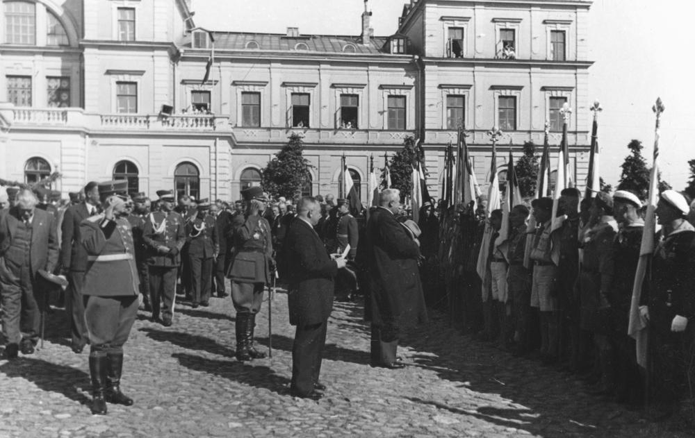 Latvijas Valsts un Ministru prezidenta Kārļa Ulmaņa un valdības pārstāvju vizīte Liepājā, par godu Latvijas Pagaidu valdības ierašanās 18. gadadienai. Viesu sagaidīšana Liepājas dzelzceļa stacijā (celta 1871. gadā, arhitekts Pauls Makss Berči, tagad Rīgas ielā 71). Priekšplānā no kreisās: 1. Liepājas pilsētas prefekts (1934-1939) Fricis Šāberts (arī Šaberts), 2. Kurzemes divīzijas komandieris, ģenerālis Oskars Dankers, 3. Liepājas pilsētas mērs, Aizputes baptistu draudzes mācītājs Evalds Rimbenieks (arī Ēvalds Rimbenieks), 4. Kārlis Ulmanis. Fonā no kreisās: 1. kara ministrs, ģenerālis Jānis Balodis, 2. iekšlietu ministrs Vilis Gulbis, 3. Latvijas armijas štāba priekšnieks, ģenerālis Mārtiņš Hartmanis.