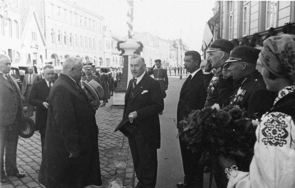 Latvijas Valsts un Ministru prezidenta Kārļa Ulmaņa un valdības pārstāvju vizīte Liepājā, par godu Latvijas Pagaidu valdības ierašanās 18. gadadienai. Viesu pavadīšana uz 15. maija namu (jeb Latviešu biedrības nams, Rožu laukumā 5/6, fonā ēkas tagad Lielajā ielā 8 un 10). Centrā no kreisās: 1. Kārlis Ulmanis, 2. Liepājas Latviešu biedrības priekšsēdētājs Augusts Šneiders, 4. Kurzemes divīzijas komandieris, ģenerālis Oskars Dankers. 2. rindā no kreisās: 1. kara ministrs, ģenerālis Jānis Balodis, 2. Liepājas pilsētas mērs, Aizputes baptistu draudzes mācītājs Evalds Rimbenieks (arī Ēvalds Rimbenieks), 3. Latvijas armijas štāba priekšnieks, ģenerālis Mārtiņš Hartmanis.