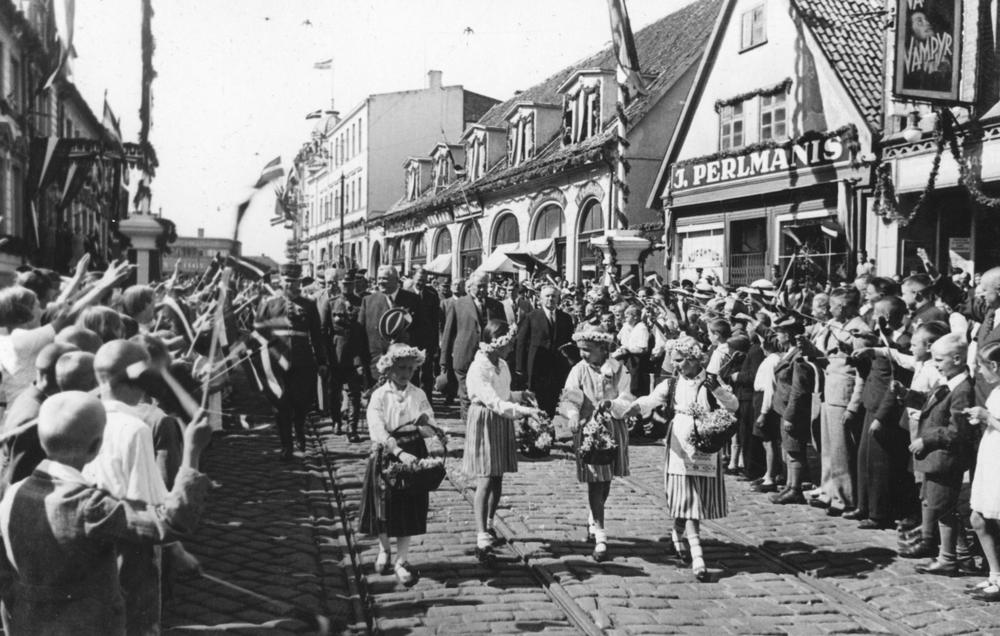 Latvijas Valsts un Ministru prezidenta Kārļa Ulmaņa un valdības pārstāvju vizīte Liepājā, par godu Latvijas Pagaidu valdības ierašanās 18. gadadienai. Liepājnieki sveic viesus. Centrā 1. rindā no kreisās: 1. Liepājas pilsētas prefekts (1934-1939) Fricis Šāberts (arī Šaberts), 2. Kārlis Ulmanis, 3. kara ministrs, ģenerālis Jānis Balodis, 4. Liepājas pilsētas mērs, Aizputes baptistu draudzes mācītājs Evalds Rimbenieks (arī Ēvalds Rimbenieks). 2. rindā no kreisās Kurzemes divīzijas komandieris, ģenerālis Oskars Dankers. 3. rindā no kreisās izglītības ministrs, profesors Augusts Tentelis. Fonā ēkas tagadējā Lielajā ielā 6, 8, 10 un 12 (ar tirgotavām "J. Perlmanis" un reklāmas izkārtni "Vampyr").