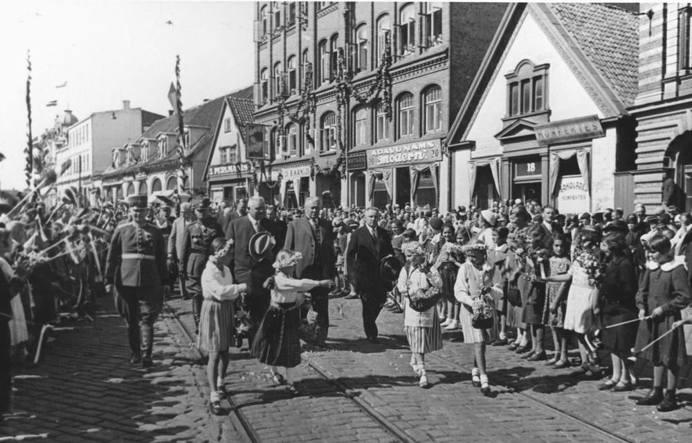 Latvijas Valsts un Ministru prezidenta Kārļa Ulmaņa un valdības pārstāvju vizīte Liepājā, par godu Latvijas Pagaidu valdības ierašanās 18. gadadienai. Liepājnieki sveic viesus. Centrā 1. rindā no kreisās: 1. Liepājas pilsētas prefekts (1934-1939) Fricis Šāberts (arī Šaberts), 2. Kārlis Ulmanis, 3. kara ministrs, ģenerālis Jānis Balodis, 4. Liepājas pilsētas mērs, Aizputes baptistu draudzes mācītājs Evalds Rimbenieks (arī Ēvalds Rimbenieks). 2. rindā no kreisās Kurzemes divīzijas komandieris, ģenerālis Oskars Dankers. 3. rindā no kreisās izglītības ministrs, profesors Augusts Tentelis. 4. rindā no kreisās Latvijas armijas štāba priekšnieks, ģenerālis Mārtiņš Hartmanis. Fonā ēkas tagadējā Lielajā ielā 8, 10 un 12 (ar tirgotavām "J. Perlmanis", "B. Kans", "Apavu nams "Moderni"", notāra biroju, reklāmas izkārtni "Vampyr" un šokolādes konfekšu veikalu).