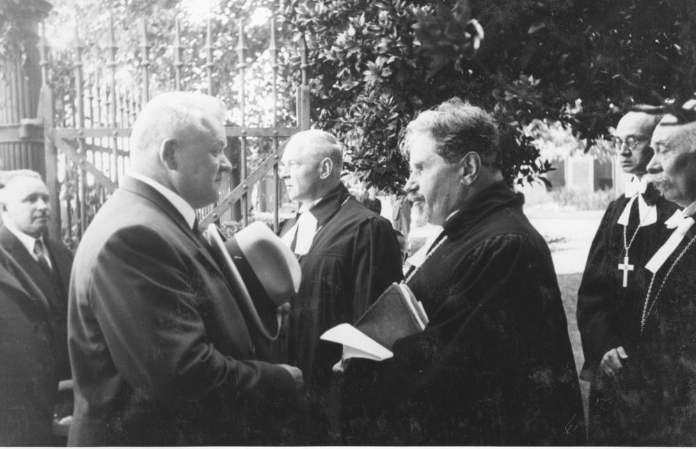 Latvijas Valsts un Ministru prezidenta Kārļa Ulmaņa un valdības pārstāvju vizīte Liepājā, par godu Latvijas Pagaidu valdības ierašanās 18. gadadienai. Viesošanās Svētās Trijādības baznīcā (tagad Svētās Trīsvienības baznīca, Lielajā ielā 9). Kārlis Ulmanis (no kreisās) sasveicinās ar mācītājiem. Fonā no kreisās: 1. Liepājas pilsētas mērs, Aizputes baptistu draudzes mācītājs Evalds Rimbenieks (arī Ēvalds Rimbenieks), 2. Grobiņas iecirkņa prāvests, doktors Visvaldis Sanders.