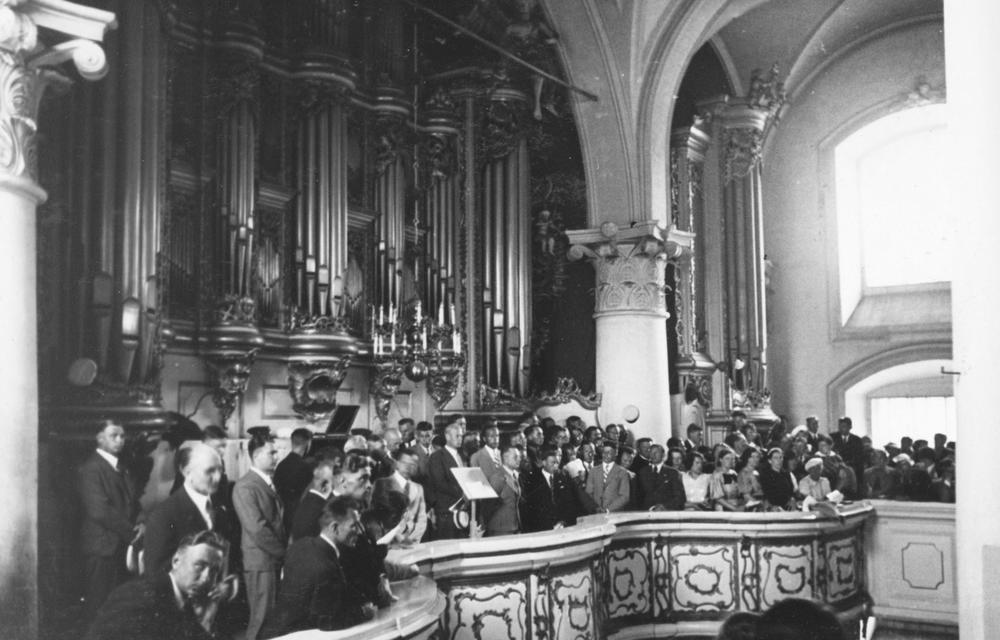 Latvijas Valsts un Ministru prezidenta Kārļa Ulmaņa un valdības pārstāvju vizīte Liepājā, par godu Latvijas Pagaidu valdības ierašanās 18. gadadienai. Kārlis Ulmanis un valdības pārstāvji piedalās dievkalpojumā Svētās Trijādības baznīcā (tagad Svētās Trīsvienības baznīca, Lielajā ielā 9). Skats uz koristiem pie ērģelēm.