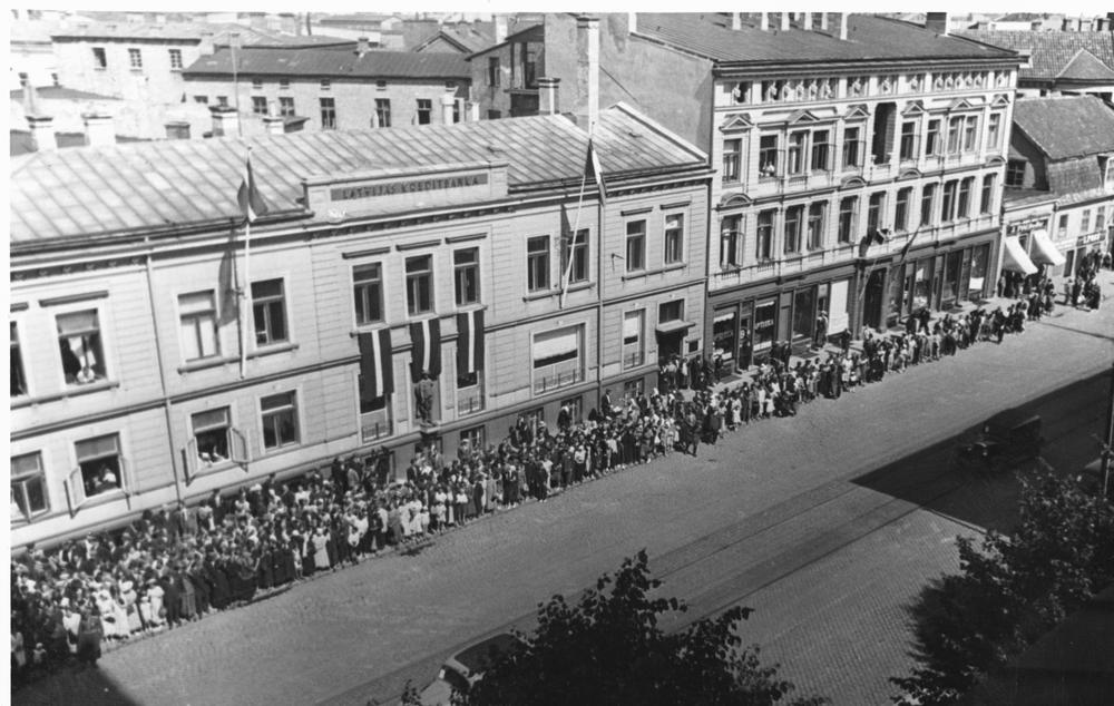 Latvijas Valsts un Ministru prezidenta Kārļa Ulmaņa un valdības pārstāvju vizīte Liepājā, par godu Latvijas Pagaidu valdības ierašanās 18. gadadienai. Liepājnieki sagaida viesus - panorāma Lielajā ielā. Fonā Mozesa Elkes tipogrāfija, augļu un spoguļu veikals Lielajā ielā 16 (tagad Lielā iela 8 blakus ēkas Lielajā ielā 6 un 10).