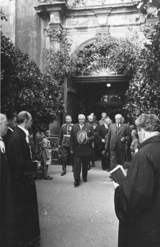 Latvijas Valsts un Ministru prezidenta Kārļa Ulmaņa un valdības pārstāvju vizīte Liepājā, par godu Latvijas Pagaidu valdības ierašanās 18. gadadienai. Viesi dodas prom no Svētās Trijādības baznīcas (tagad Svētās Trīsvienības baznīca Lielajā ielā 9) pēc dievkalpojuma. Centrā Kārlis Ulmanis. 1. rindā no kreisās: 1. Liepājas pilsētas prefekts (1934-1939) Fricis Šāberts (arī Šaberts), 2. kara ministrs ģenerālis Jānis Balodis. 2. rindā no kreisās: 1. Kurzemes divīzijas komandieris, ģenerālis Oskars Dankers, 2. Liepājas pilsētas mērs, Aizputes baptistu draudzes mācītājs Evalds Rimbenieks (arī Ēvalds Rimbenieks). 3. rindā no labās 1. izglītības ministrs, profesors Augusts Tentelis.