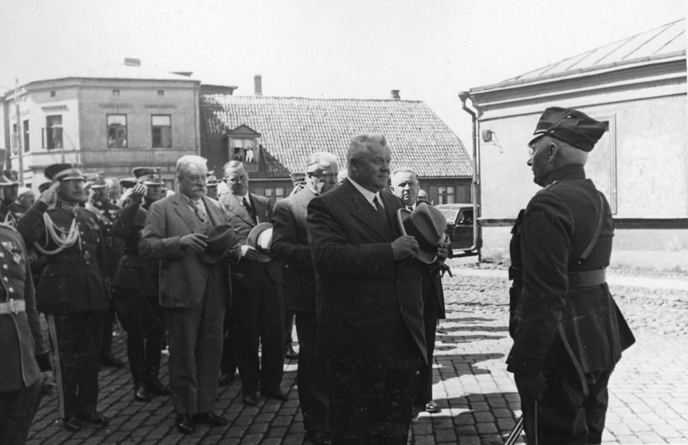Latvijas Valsts un Ministru prezidenta Kārļa Ulmaņa un valdības pārstāvju vizīte Liepājā, par godu Latvijas Pagaidu valdības ierašanās 18. gadadienai. Liepājnieki sagaida viesus. Viesu sagaidīšana Liepājas kara ostā, Kārlis Ulmanis (priekšplānā no kreisās) pieņem 15. Liepājas aizsargu pulka komandiera K. Tikmaņa ziņojumu 1. rindā kara ministrs, ģenerālis Jānis Balodis. 2. rindā no kreisās: 1. izglītības ministrs, profesors Augusts Tentelis, 2. iekšlietu ministrs Vilis Gulbis, 3. Liepājas pilsētas mērs, Aizputes baptistu draudzes mācītājs Evalds Rimbenieks (arī Ēvalds Rimbenieks).