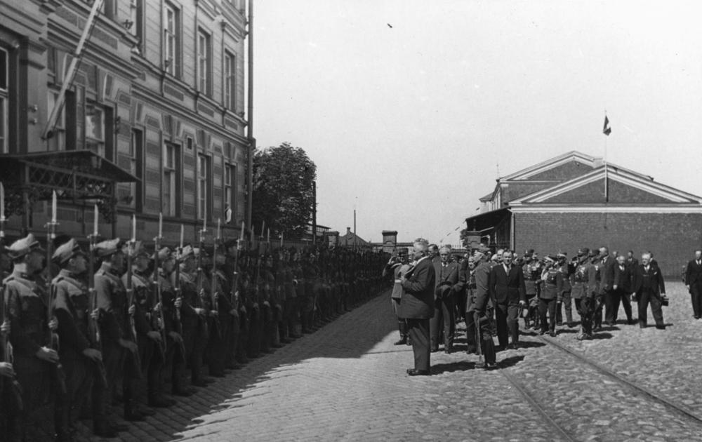 Latvijas Valsts un Ministru prezidenta Kārļa Ulmaņa un valdības pārstāvju vizīte Liepājā, par godu Latvijas Pagaidu valdības ierašanās 18. gadadienai. Kārlis Ulmanis pieņem aizsargu parādi Liepājas kara ostā. 2. rindā no kreisās: 2. kara ministrs, ģenerālis Jānis Balodis, 3. zemkopības ministrs Jānis Birznieks.