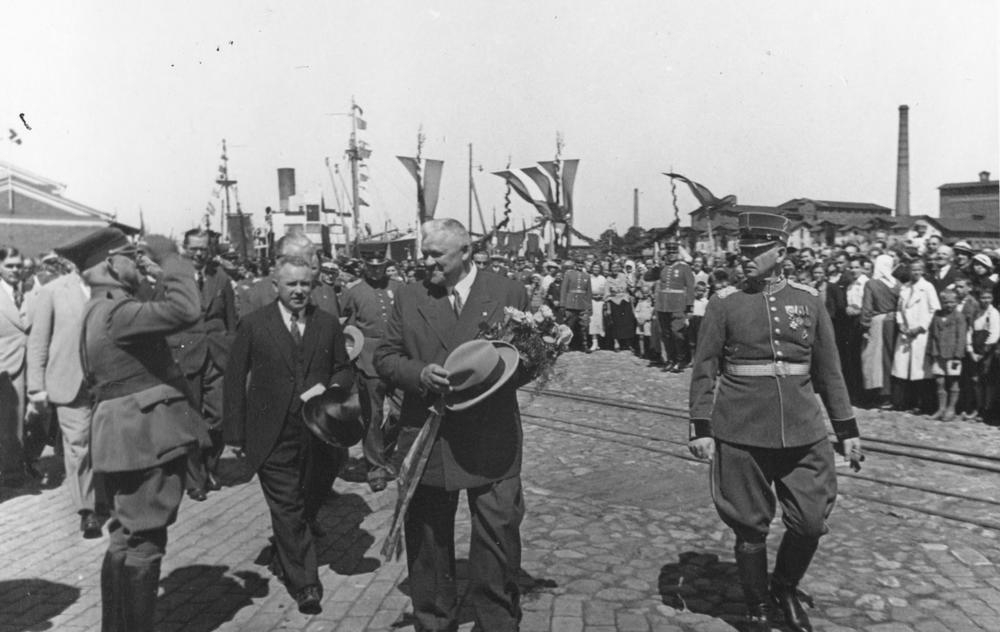 Latvijas Valsts un Ministru prezidenta Kārļa Ulmaņa un valdības pārstāvju vizīte Liepājā, par godu Latvijas Pagaidu valdības ierašanās 18. gadadienai. Viesi dodas projām no "Vadoņa ozola", kas stādīts piemiņai 1919. gada notikumiem, kad ar kuģi "Saratov" Liepājā ieradās Latvijas Pagaidu valdība (tagad Spīķeru ielas un Vecās ostmalas ielas krustojumā). 1. rindā no kreisās: 2. Liepājas pilsētas mērs, Aizputes baptistu draudzes mācītājs Evalds Rimbenieks (arī Ēvalds Rimbenieks), 2. Kārlis Ulmanis, 3. Liepājas pilsētas prefekts (1934-1939) Fricis Šāberts (arī Šaberts). 2. rindā no kreisās 2. iekšlietu ministrs Vilis Gulbis.