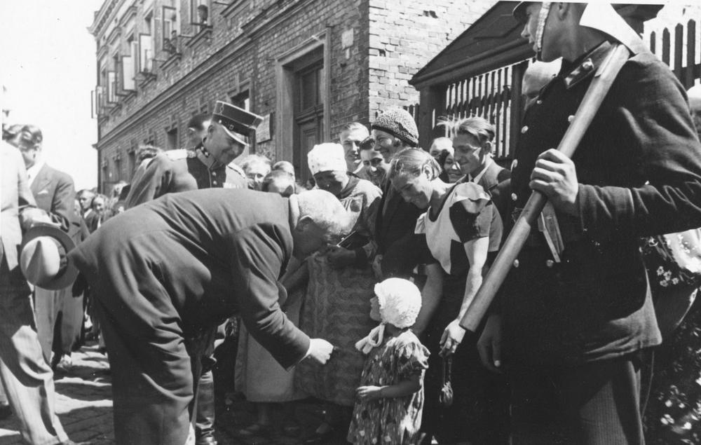 Latvijas Valsts un Ministru prezidenta Kārļa Ulmaņa un valdības pārstāvju vizīte Liepājā, par godu Latvijas Pagaidu valdības ierašanās 18. gadadienai. Kārlis Ulmanis sasveicinās ar Liepājas iedzīvotājiem, viesošanās laikā Liepājas kara ostā. Fonā no kreisās Liepājas pilsētas prefekts (1934-1939) Fricis Šāberts (arī Šaberts).