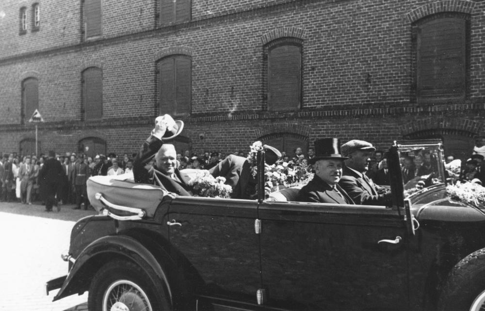 Latvijas Valsts un Ministru prezidenta Kārļa Ulmaņa un valdības pārstāvju vizīte Liepājā, par godu Latvijas Pagaidu valdības ierašanās 18. gadadienai. Automašīnā (tagad Spīķeru ielā) no kreisās: 1. Kārlis Ulmanis, 2. Liepājas pilsētas mērs, Aizputes baptistu draudzes mācītājs Evalds Rimbenieks (arī Ēvalds Rimbenieks).
