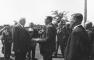 Latvijas Valsts un Ministru prezidenta Kārļa Ulmaņa un valdības pārstāvju vizīte Liepājā, par godu Latvijas Pagaidu valdības ierašanās 18. gadadienai. Viesošanās laikā Liepājas zvejas ostā. Liepājas rajona zvejnieku kooperatīvu vārdā, Liepājas zvejnieku kooperatīva priekšnieks Ž. Priedols (no labās) pasniedz Kārlim Ulmanim piemiņas albumu. Fonā (centrā) zemkopības ministrs Jānis Birznieks un fotogrāfi.
