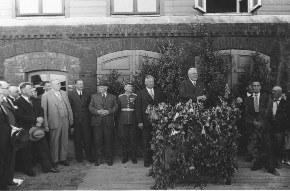 Latvijas Valsts un Ministru prezidenta Kārļa Ulmaņa un valdības pārstāvju vizīte Liepājā, par godu Latvijas Pagaidu valdības ierašanās 18. gadadienai. Kārlis Ulmanis (tribīnē) uzrunā klātesošos Liepājas zvejas ostā. 1. rindā no labās: 3. zemkopības ministrs Jānis Birznieks, 4. izglītības ministrs, profesors Augusts Tentelis, 5. iekšlietu ministrs Vilis Gulbis, 6. kara ministrs, ģenerālis Jānis Balodis, 7. Liepājas pilsētas prefekts (1934-1939) Fricis Šāberts (arī Šaberts).