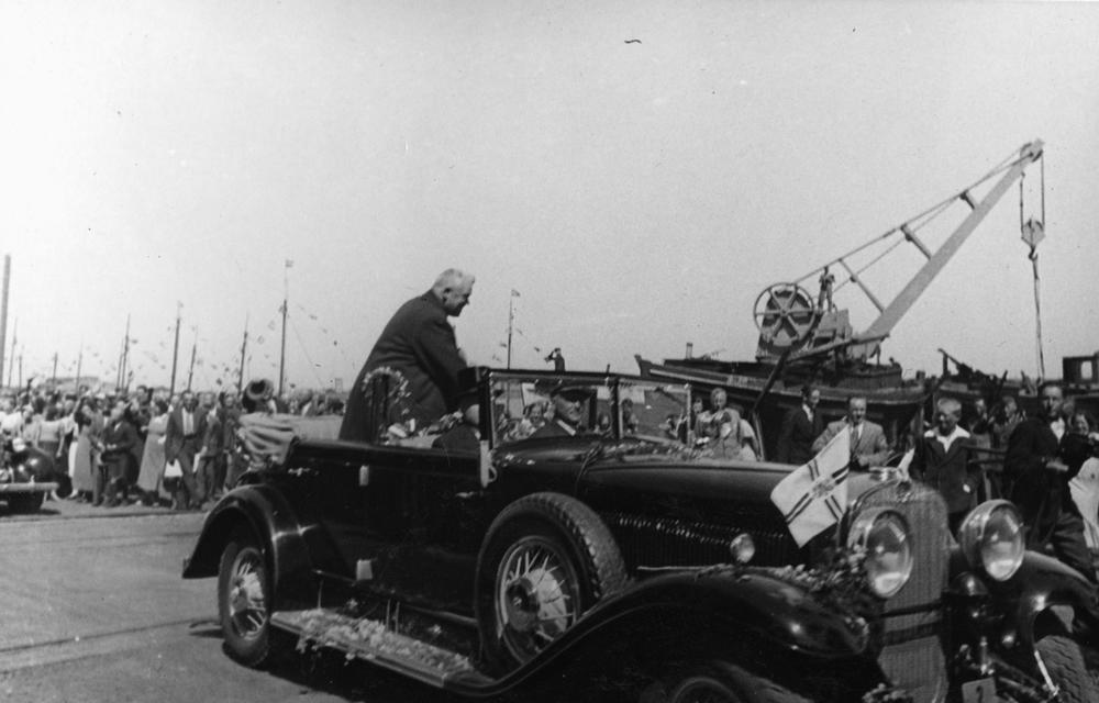 Latvijas Valsts un Ministru prezidenta Kārļa Ulmaņa un valdības pārstāvju vizīte Liepājā, par godu Latvijas Pagaidu valdības ierašanās 18. gadadienai. Kārlis Ulmanis (automašīnā) atvadās no liepājniekiem, pirms aizbraukšanas no Liepājas Zvejas ostas.