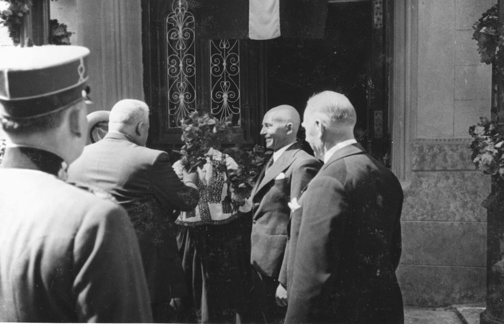 Latvijas Valsts un Ministru prezidenta Kārļa Ulmaņa un valdības pārstāvju vizīte Liepājā, par godu Latvijas Pagaidu valdības ierašanās 18. gadadienai. Viesu sagaidīšana pie 15. maija nama (jeb Latviešu biedrības nams, Rožu laukumā 5/6). Kārlim Ulmanim pasniedz ziedus.