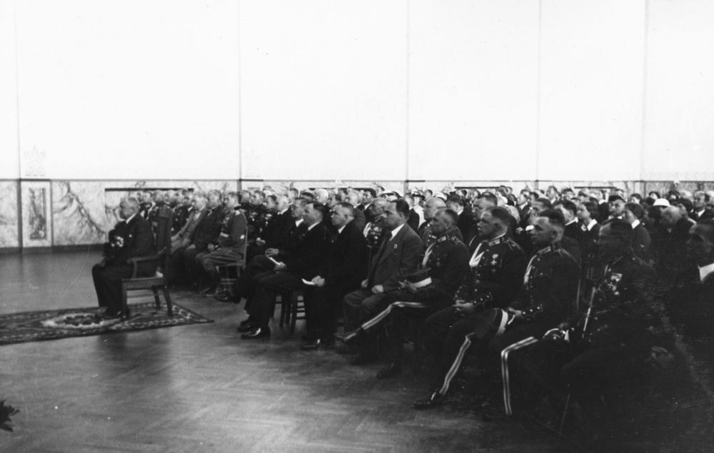 Latvijas Valsts un Ministru prezidenta Kārļa Ulmaņa un valdības pārstāvju vizīte Liepājā, par godu Latvijas Pagaidu valdības ierašanās 18. gadadienai. Svinīgajā pasākumā 15. maija namā (jeb Latviešu biedrības nams, Rožu laukumā 5/6) Kārlim Ulmanim (centrā ar rozēm) pasniedz adresi. 1. rindā no kreisās: 6. izglītības ministrs, profesors Augusts Tentelis, 7. kara ministrs, ģenerālis Jānis Balodis, 9. iekšlietu ministrs Vilis Gulbis, 10. zemkopības ministrs Jānis Birznieks, 11. Liepājas pilsētas mērs, Aizputes baptistu draudzes mācītājs Evalds Rimbenieks (arī Ēvalds Rimbenieks).