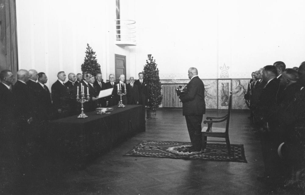 Latvijas Valsts un Ministru prezidenta Kārļa Ulmaņa un valdības pārstāvju vizīte Liepājā, par godu Latvijas Pagaidu valdības ierašanās 18. gadadienai. Svinīgajā pasākumā 15. maija namā (jeb Latviešu biedrības nams, Rožu laukumā 5/6) Kārlim Ulmanim (centrā ar rozēm) pasniedz adresi. 1. rindā no labās: 1. zemkopības ministrs Jānis Birznieks, 2. Liepājas pilsētas mērs, Aizputes baptistu draudzes mācītājs Evalds Rimbenieks (arī Ēvalds Rimbenieks).