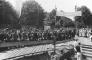 Latvijas Valsts un Ministru prezidenta Kārļa Ulmaņa un valdības pārstāvju vizīte Liepājā, par godu Latvijas Pagaidu valdības ierašanās 18. gadadienai. Svinīgs pasākums, kas veltīts jaunās Liepājas pilsētas 28. janvāra Draudzīga aicinājuma pamatskolas (Jaunliepājā - Krišjāņa Barona un 1905. gada ielas krustojumā, tagad Liepājas 5. vidusskola, Rīgas ielā 50) pamatakmens ielikšanai. 1. rindā no kreisās: 5. Kurzemes divīzijas komandieris, ģenerālis Oskars Dankers, 6. Valsts kancelejas direktors Dāvids Rudzītis, 8. Rīgas pilsētas mērs (1936-1940) Roberts Liepiņš, 9. zemkopības ministrs Jānis Birznieks, 10. izglītības ministrs, profesors Augusts Tentelis, 12. Kārlis Ulmanis, 13. kara ministrs, ģenerālis Jānis Balodis. Goda vārtus rotā uzraksts "Jaunatnes sirds saulē mirdz zelta ābeles stādītājam".