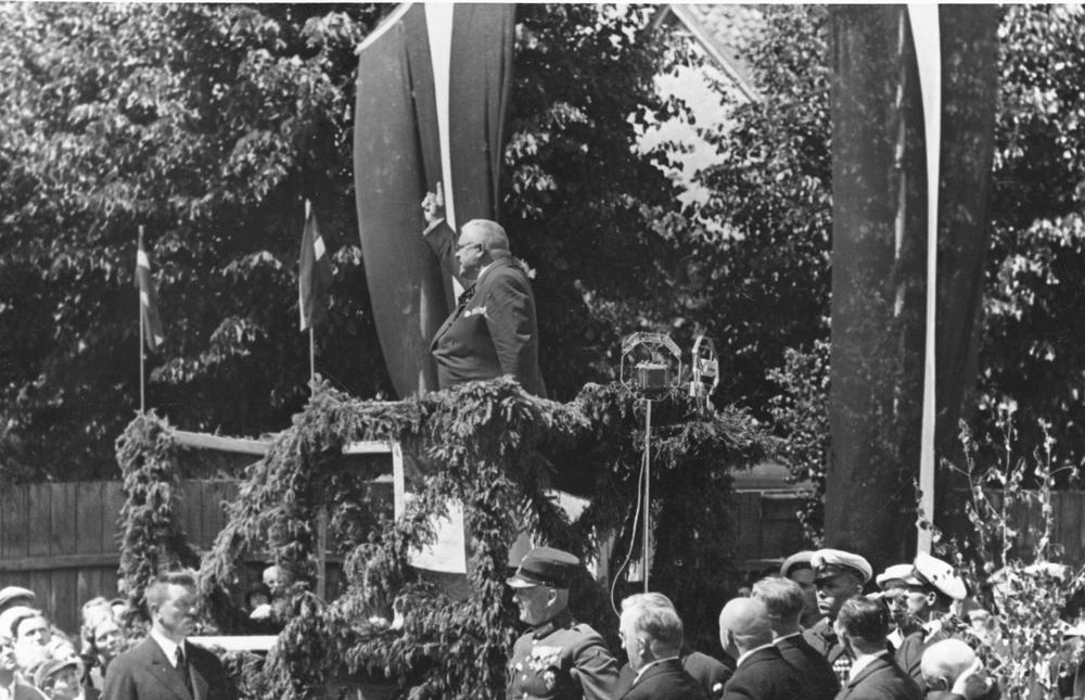 Latvijas Valsts un Ministru prezidenta Kārļa Ulmaņa un valdības pārstāvju vizīte Liepājā, par godu Latvijas Pagaidu valdības ierašanās 18. gadadienai. Svinīgs pasākums, kas veltīts jaunās Liepājas pilsētas 28. janvāra Draudzīga aicinājuma pamatskolas (Jaunliepājā - Krišjāņa Barona un 1905. gada ielas krustojumā, tagad Liepājas 5. vidusskola, Rīgas ielā 50) pamatakmens ielikšanai. Klātesošos tribīnē uzrunā Kārlis Ulmanis. Priekšplānā no kreisās 2. Kurzemes divīzijas komandieris, ģenerālis Oskars Dankers.
