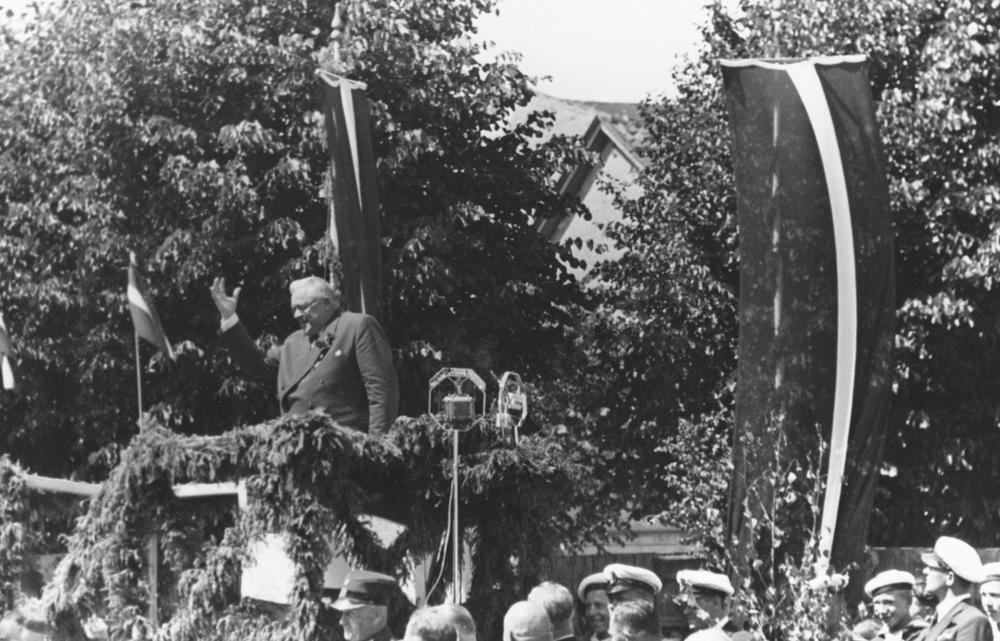 Latvijas Valsts un Ministru prezidenta Kārļa Ulmaņa un valdības pārstāvju vizīte Liepājā, par godu Latvijas Pagaidu valdības ierašanās 18. gadadienai. Svinīgs pasākums, kas veltīts jaunās Liepājas pilsētas 28. janvāra Draudzīga aicinājuma pamatskolas (Jaunliepājā - Krišjāņa Barona un 1905. gada ielas krustojumā, tagad Liepājas 5. vidusskola, Rīgas ielā 50) pamatakmens ielikšanai. Klātesošos tribīnē uzrunā Kārlis Ulmanis. Priekšplānā no kreisās 1. Kurzemes divīzijas komandieris, ģenerālis Oskars Dankers.