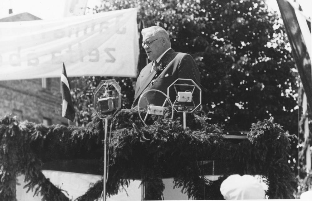 Latvijas Valsts un Ministru prezidenta Kārļa Ulmaņa un valdības pārstāvju vizīte Liepājā, par godu Latvijas Pagaidu valdības ierašanās 18. gadadienai. Svinīgs pasākums, kas veltīts jaunās Liepājas pilsētas 28. janvāra Draudzīga aicinājuma pamatskolas (Jaunliepājā - Krišjāņa Barona un 1905. gada ielas krustojumā, tagad Liepājas 5. vidusskola, Rīgas ielā 50) pamatakmens ielikšanai. Klātesošos tribīnē uzrunā Kārlis Ulmanis. Priekšplānā stūru mikrofoni RIBBON (?).