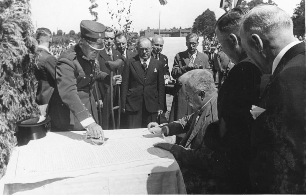Latvijas Valsts un Ministru prezidenta Kārļa Ulmaņa un valdības pārstāvju vizīte Liepājā, par godu Latvijas Pagaidu valdības ierašanās 18. gadadienai. Svinīgs pasākums, kas veltīts jaunās Liepājas pilsētas 28. janvāra Draudzīga aicinājuma pamatskolas (Jaunliepājā - Krišjāņa Barona un 1905. gada ielas krustojumā, tagad Liepājas 5. vidusskola, Rīgas ielā 50) pamatakmens ielikšanai. Izglītības ministrs, profesors Augusts Tentelis paraksta aktu par skolas celtniecību. Priekšplānā no labās 2. zemkopības ministrs Jānis Birznieks.