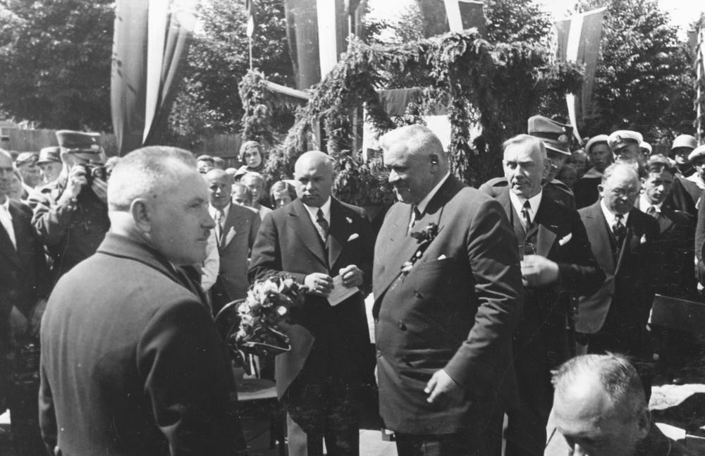 Latvijas Valsts un Ministru prezidenta Kārļa Ulmaņa un valdības pārstāvju vizīte Liepājā, par godu Latvijas Pagaidu valdības ierašanās 18. gadadienai. Svinīgs pasākums, kas veltīts jaunās Liepājas pilsētas 28. janvāra Draudzīga aicinājuma pamatskolas (Jaunliepājā - Krišjāņa Barona un 1905. gada ielas krustojumā, tagad Liepājas 5. vidusskola, Rīgas ielā 50) pamatakmens ielikšanai. Priekšplānā Liepājas pilsētas mērs, Aizputes baptistu draudzes mācītājs Evalds Rimbenieks (arī Ēvalds Rimbenieks). Centrā Kārlis Ulmanis sarunājas ar sveicēju. 1. rindā no labās 1. Liepājas Latviešu biedrības priekšsēdētājs Augusts Šneiders. 2. rindā no kreisās 2. Latvijas Republikas Izglītības ministrijas Skolu departamenta Būvniecības biroja vadītājs (1923-1938), arhitekts Indriķis Blankenburgs (?).