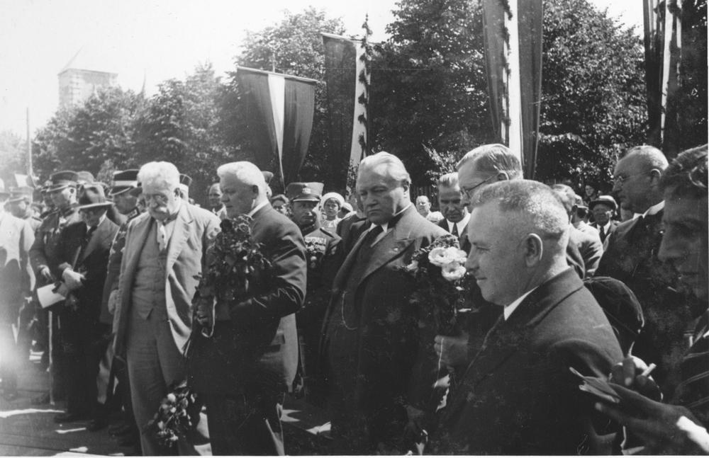 Latvijas Valsts un Ministru prezidenta Kārļa Ulmaņa un valdības pārstāvju vizīte Liepājā, par godu Latvijas Pagaidu valdības ierašanās 18. gadadienai. Svinīgs pasākums, kas veltīts jaunās Liepājas pilsētas 28. janvāra Draudzīga aicinājuma pamatskolas (Jaunliepājā - Krišjāņa Barona un 1905. gada ielas krustojumā, tagad Liepājas 5. vidusskola, Rīgas ielā 50) pamatakmens ielikšanai. 1. rindā no kreisās: 1. Kurzemes divīzijas komandieris, ģenerālis Oskars Dankers, 2. Valsts kancelejas direktors Dāvids Rudzītis, 3. Latvijas armijas štāba priekšnieks, ģenerālis Mārtiņš Hartmanis, 4. izglītības ministrs, profesors Augusts Tentelis, 5. Kārlis Ulmanis, 6. kara ministrs, ģenerālis Jānis Balodis, 7. iekšlietu ministrs Vilis Gulbis, 8. Liepājas pilsētas mērs, Aizputes baptistu draudzes mācītājs Evalds Rimbenieks (arī Ēvalds Rimbenieks).