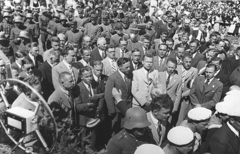 Latvijas Valsts un Ministru prezidenta Kārļa Ulmaņa un valdības pārstāvju vizīte Liepājā, par godu Latvijas Pagaidu valdības ierašanās 18. gadadienai. Svinīgs pasākums, kas veltīts jaunās Liepājas pilsētas 28. janvāra Draudzīga aicinājuma pamatskolas (Jaunliepājā - Krišjāņa Barona un 1905. gada ielas krustojumā, tagad Liepājas 5. vidusskola, Rīgas ielā 50) pamatakmens ielikšanai. Priekšplānā vīru koris "Dziedonis" dzied "Tev mūžam dzīvot, Latvija!". Pa kreisi stūru mikrofons RIBBON (?).