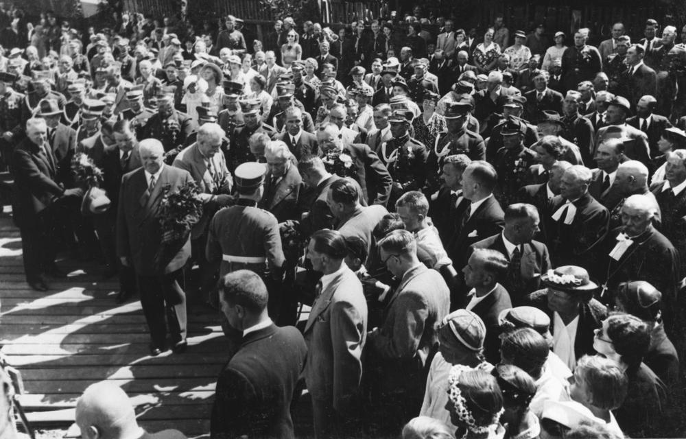 Latvijas Valsts un Ministru prezidenta Kārļa Ulmaņa un valdības pārstāvju vizīte Liepājā, par godu Latvijas Pagaidu valdības ierašanās 18. gadadienai. Svinīgs pasākums, kas veltīts jaunās Liepājas pilsētas 28. janvāra Draudzīga aicinājuma pamatskolas (Jaunliepājā - Krišjāņa Barona un 1905. gada ielas krustojumā, tagad Liepājas 5. vidusskola, Rīgas ielā 50) pamatakmens ielikšanai. 1. rindā no kreisās: 1. Liepājas pilsētas mērs, Aizputes baptistu draudzes mācītājs Evalds Rimbenieks (arī Ēvalds Rimbenieks), 2. Kārlis Ulmanis, 3. Liepājas pilsētas prefekts (1934-1939) Fricis Šāberts (arī Šaberts), 4. sabiedrisko lietu ministrs Alfreds Jēkabs Bērziņš. 2. rindā no kreisās: 1. Valsts kancelejas direktors Dāvids Rudzītis, 2. Latvijas armijas štāba priekšnieks, ģenerālis Mārtiņš Hartmanis, 3. iekšlietu ministrs Vilis Gulbis, 4. zemkopības ministrs Jānis Birznieks, 5. izglītības ministrs, profesors Augusts Tentelis, 6. kara ministrs, ģenerālis Jānis Balodis.