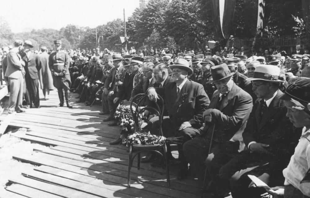 Latvijas Valsts un Ministru prezidenta Kārļa Ulmaņa un valdības pārstāvju vizīte Liepājā, par godu Latvijas Pagaidu valdības ierašanās 18. gadadienai. Svinīgs pasākums, kas veltīts jaunās Liepājas pilsētas 28. janvāra Draudzīga aicinājuma pamatskolas (Jaunliepājā - Krišjāņa Barona un 1905. gada ielas krustojumā, tagad Liepājas 5. vidusskola, Rīgas ielā 50) pamatakmens ielikšanai. 1. rindā no labās: 1. Valsts kancelejas direktors Dāvids Rudzītis, 2. Latvijas armijas štāba priekšnieks, ģenerālis Mārtiņš Hartmanis, 4. zemkopības ministrs Jānis Birznieks, 5. Kārlis Ulmanis, 6. kara ministrs, ģenerālis Jānis Balodis, 7. iekšlietu ministrs Vilis Gulbis. Centrā stāv Liepājas pilsētas prefekts (1934-1939) Fricis Šāberts (arī Šaberts).