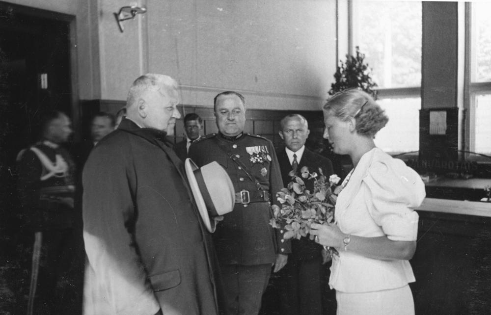 Latvijas Valsts un Ministru prezidenta Kārļa Ulmaņa un valdības pārstāvju vizīte Liepājā, par godu Latvijas Pagaidu valdības ierašanās 18. gadadienai. Viesu sagaidīšana Liepājas pilsētas krājkasē un lombardā (ēka celta 1936.-1937. gadā, arhitekts Valdis Zēbauers, tagad Baznīcas ielā 4/6). Rožu pušķi Kārlim Ulmanim (priekšplānā no kreisās) pasniedz kases darbiniece E. Pikola.