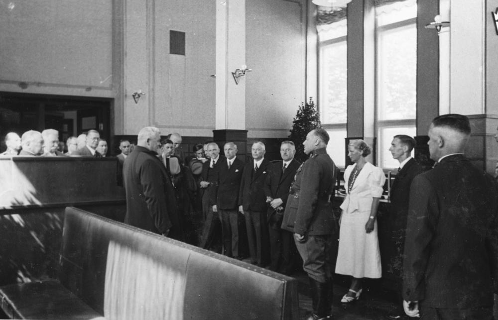 Latvijas Valsts un Ministru prezidenta Kārļa Ulmaņa un valdības pārstāvju vizīte Liepājā, par godu Latvijas Pagaidu valdības ierašanās 18. gadadienai. Viesu sagaidīšana Liepājas pilsētas krājkasē un lombardā (ēka celta 1936.-1937. gadā, arhitekts Valdis Zēbauers, tagad Baznīcas ielā 4/6). Priekšplānā no kreisās Kārlis Ulmanis. 1. rindā no kreisās: 4. Liepājas pilsētas mērs, Aizputes baptistu draudzes mācītājs Evalds Rimbenieks (arī Ēvalds Rimbenieks), 5. kases darbiniece E. Pikola. Fonā no kreisās: 1. kara ministrs, ģenerālis Jānis Balodis, 2. izglītības ministrs, profesors Augusts Tentelis, 3. iekšlietu ministrs Vilis Gulbis.