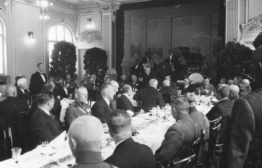 Latvijas Valsts un Ministru prezidenta Kārļa Ulmaņa un valdības pārstāvju vizīte Liepājā, par godu Latvijas Pagaidu valdības ierašanās 18. gadadienai. Pusdienas par godu Liepājas viesiem, "Pilsētas viesnīca" zālē (ēka nav saglabājusies, tagad Lielā iela 7). 1. rindā no kreisās: 1. Latvijas armijas štāba priekšnieks, ģenerālis Mārtiņš Hartmanis, 2. izglītības ministrs. profesors Augusts Tentelis, 3. kara ministrs, ģenerālis Jānis Balodis, 5. Kurzemes divīzijas komandieris, ģenerālis Oskars Dankers, 6. Kārlis Ulmanis, 7. Liepājas pilsētas mērs, Aizputes baptistu draudzes mācītājs Evalds Rimbenieks (arī Ēvalds Rimbenieks), 8. iekšlietu ministrs Vilis Gulbis, 10. zemkopības ministrs Jānis Birznieks. Fonā uz skatuves viesnīcas orķestris.