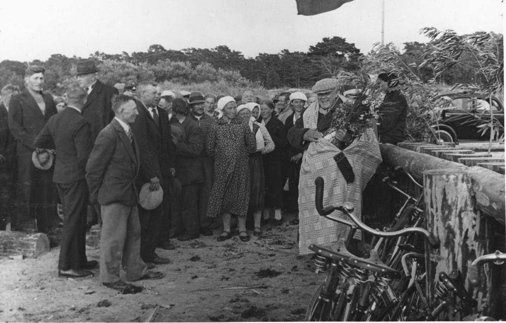 Latvijas Valsts un Ministru prezidenta Kārļa Ulmaņa un valdības pārstāvju vizīte Liepājā, par godu Latvijas Pagaidu valdības ierašanās 18. gadadienai. Valdības pārstāvju ceļojums pa Kurzemes jūrmalu, Klampju ciema (tagad Nīcas pagasta Klampjuciems) iedzīvotāji sagaida viesus. No labās, pie divriteņu novietnes, ar dāvanā saņemtajiem pļavas ziediem un austo lina dvieli Kārlis Ulmanis. 2. rindā no kreisās: 2. kara ministrs, ģenerālis Jānis Balodis, 6. Liepājas apriņķa lauku pašvaldības vecākais, literāts (pseidonīms Purvidus) Eduards Līcis.