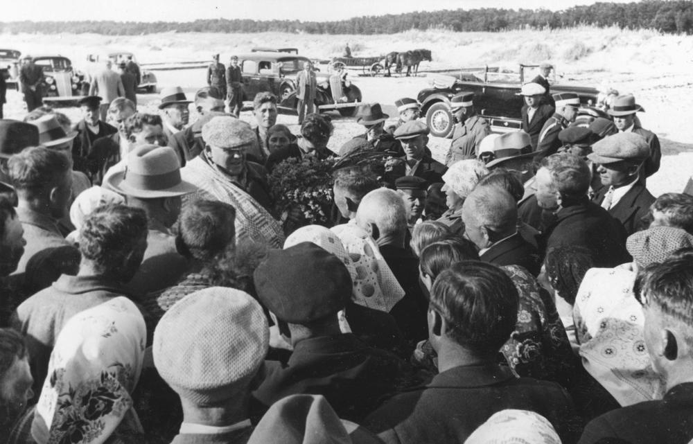 Latvijas Valsts un Ministru prezidenta Kārļa Ulmaņa un valdības pārstāvju vizīte Liepājā, par godu Latvijas Pagaidu valdības ierašanās 18. gadadienai. Valdības pārstāvju ceļojums pa Kurzemes jūrmalu - viesu sagaidīšana Klampju ciemā (tagad Nīcas pagasta Klampjuciems). Centrā Kārlis Ulmanis (ar dāvināto austo lina dvieli) sarunājas ar vietējiem iedzīvotājiem. Fonā no labās 3. Kārļa Ulmaņa adjutants, pulkvedis Miervaldis Lūkins.