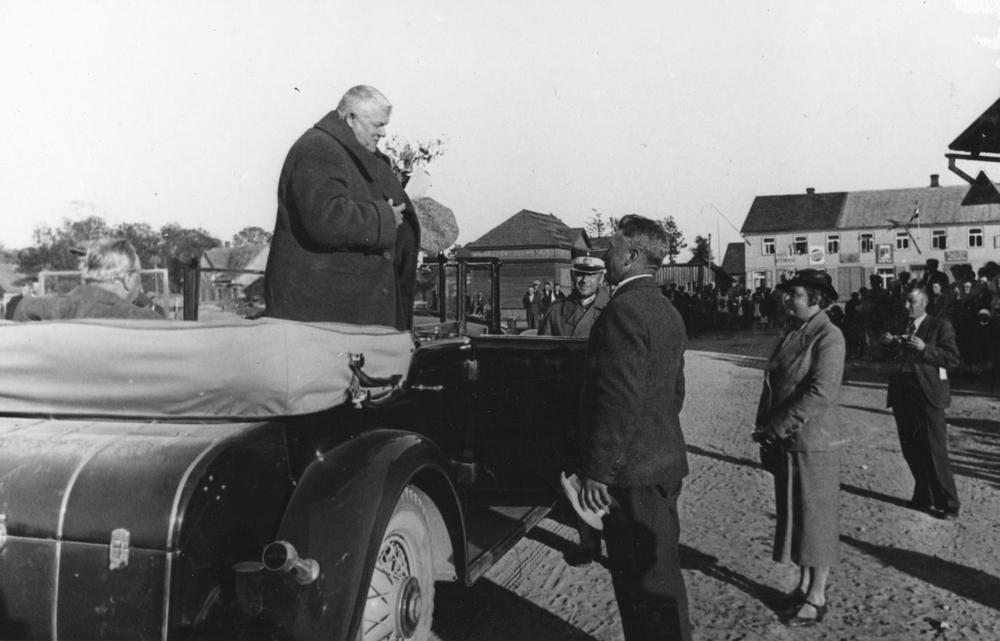 Latvijas Valsts un Ministru prezidenta Kārļa Ulmaņa un valdības pārstāvju vizīte Liepājā, par godu Latvijas Pagaidu valdības ierašanās 18. gadadienai. Valdības pārstāvju ceļojums pa Kurzemes jūrmalu - viesu sagaidīšana Rucavā. Automašīnā no kreisās: 1. kara ministrs Jānis Balodis, 2. Kārlis Ulmanis ar saņemtajiem ziediem. Fonā pie auto Kārļa Ulmaņa adjutants, pulkvedis Miervaldis Lūkins.