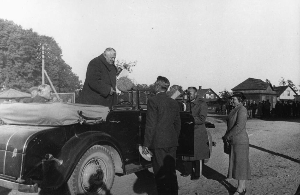 Latvijas Valsts un Ministru prezidenta Kārļa Ulmaņa un valdības pārstāvju vizīte Liepājā, par godu Latvijas Pagaidu valdības ierašanās 18. gadadienai. Valdības pārstāvju ceļojums pa Kurzemes jūrmalu - viesu sagaidīšana Rucavā. Automašīnā no kreisās: 1. kara ministrs Jānis Balodis, 2. Kārlis Ulmanis ar saņemtajiem ziediem. Fonā pie auto Kārļa Ulmaņa adjutants, pulkvedis Miervaldis Lūkins.