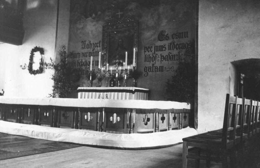 Latvijas Valsts un Ministru prezidenta Kārļa Ulmaņa un valdības pārstāvju vizīte Liepājā, par godu Latvijas Pagaidu valdības ierašanās 18. gadadienai. Valdības pārstāvju ceļojums pa Kurzemes jūrmalu Rucavā. Rucavas Evanģēliski luteriskās baznīcas altāris.