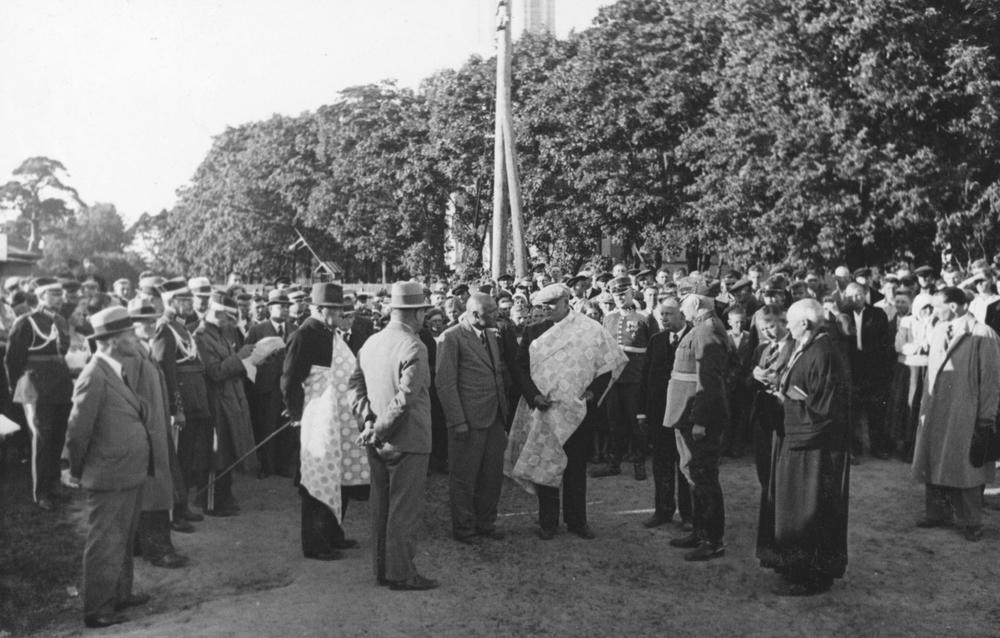Latvijas Valsts un Ministru prezidenta Kārļa Ulmaņa un valdības pārstāvju vizīte Liepājā, par godu Latvijas Pagaidu valdības ierašanās 18. gadadienai. Valdības pārstāvju ceļojums pa Kurzemes jūrmalu - viesi apskata Rucavu. Centrā no kreisās: 1. zemkopības ministrs Jānis Birznieks, 2. kara ministrs, ģenerālis Jānis Balodis, 4. Kārlis Ulmanis, 5. Liepājas apriņķa lauku pašvaldības vecākais, literāts (pseidonīms Purvidus) Eduards Līcis, 6. Liepājas-Aizputes apriņķa priekšnieks Kārlis Tikmanis, 8. Rucavas Evanģēliski luteriskās baznīcas mācītāju Pēteris Roberts Kamols. 1. rindā no kreisās: 3. Latvijas armijas štāba priekšnieks, ģenerālis Mārtiņš Hartmanis, 4. Kārļa Ulmaņa adjutants, pulkvedis Miervaldis Lūkins, 6. Valsts kancelejas direktors Dāvids Rudzītis, 8. Liepājas pilsētas prefekts (1934-1939) Fricis Šāberts (arī Šaberts), 9. sabiedrisko lietu ministrs Alfreds Jēkabs Bērziņš.