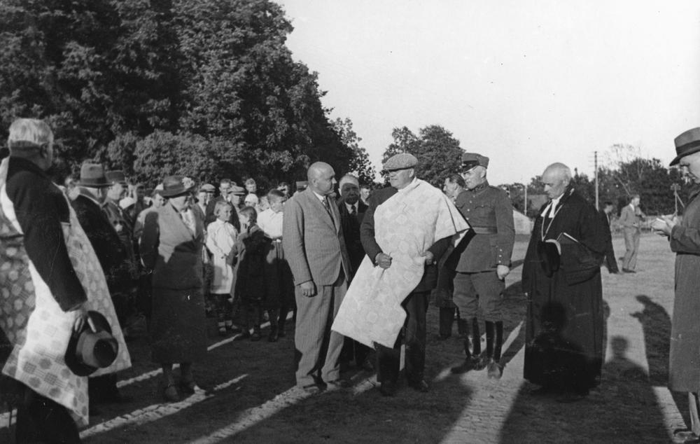Latvijas Valsts un Ministru prezidenta Kārļa Ulmaņa un valdības pārstāvju vizīte Liepājā, par godu Latvijas Pagaidu valdības ierašanās 18. gadadienai. Valdības pārstāvju ceļojums pa Kurzemes jūrmalu - viesi apskata Rucavu ar dāvanā saņemtiem austajiem linu dvieļiem. Priekšplānā no kreisās kara ministrs, ģenerālis Jānis Balodis. Centrā no kreisās: 2. Liepājas apriņķa lauku pašvaldības vecākais, literāts (pseidonīms Purvidus) Eduards Līcis, 3. Kārlis Ulmanis, 4. Liepājas-Aizputes apriņķa priekšnieks Kārlis Tikmanis, 5. Rucavas Evanģēliski luteriskās baznīcas mācītājs Pēteris Roberts Kamols.