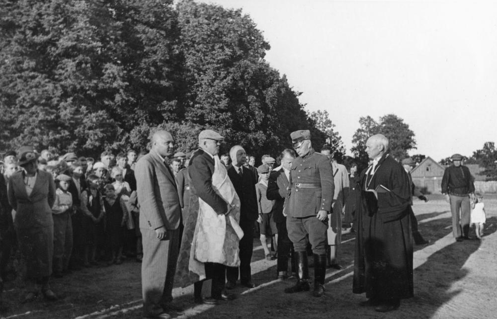 Latvijas Valsts un Ministru prezidenta Kārļa Ulmaņa un valdības pārstāvju vizīte Liepājā, par godu Latvijas Pagaidu valdības ierašanās 18. gadadienai. Valdības pārstāvju ceļojums pa Kurzemes jūrmalu - viesi apskata Rucavu. Centrā no kreisās: 2. Kārlis Ulmanis (ar dāvanā saņemto austo linu dvieli), 3. Liepājas apriņķa lauku pašvaldības vecākais, literāts (pseidonīms Purvidus) Eduards Līcis, 5. Liepājas-Aizputes apriņķa priekšnieks Kārlis Tikmanis, 6. Rucavas Evanģēliski luteriskās baznīcas mācītāju Pēteris Roberts Kamols.
