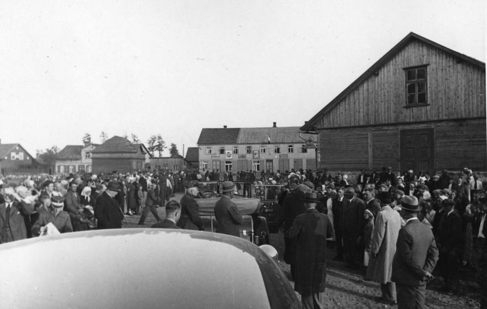 Latvijas Valsts un Ministru prezidenta Kārļa Ulmaņa un valdības pārstāvju vizīte Liepājā, par godu Latvijas Pagaidu valdības ierašanās 18. gadadienai. Valdības pārstāvju ceļojums pa Kurzemes jūrmalu - viesu sagaidīšana Rucavā. Pie mašīnas no kreisās: 2. Kārļa Ulmaņa adjutants, pulkvedis Miervaldis Lūkins, 3. kara ministrs, ģenerālis Jānis Balodis, 5. Liepājas-Aizputes apriņķa priekšnieks Kārlis Tikmanis, 7. zemkopības ministrs Jānis Birznieks, 8. Kārlis Ulmanis.