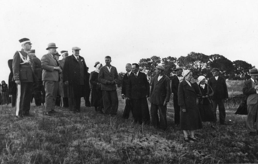 Latvijas Valsts un Ministru prezidenta Kārļa Ulmaņa un valdības pārstāvju vizīte Liepājā, par godu Latvijas Pagaidu valdības ierašanās 18. gadadienai. Valdības pārstāvju ceļojums pa Kurzemes jūrmalu - viesu sagaidīšana Nidas ciemā. 1. rindā no kreisās: 1. Latvijas armijas štāba priekšnieks, ģenerālis Mārtiņš Hartmanis, 2. zemkopības ministrs Jānis Birznieks, 3. Kārlis Ulmanis, 5. Liepājas apriņķa lauku pašvaldības vecākais, literāts (pseidonīms Purvidus) Eduards Līcis, 6. Nidas ciema vecākais un lielākā Nidas veikala īpašnieks Fricis Frēze (arī Freze) (?). 2. rindā no kreisās: 1. Liepājas-Aizputes apriņķa priekšnieks Kārlis Tikmanis, 3. Kārļa Ulmaņa adjutants, pulkvedis Miervaldis Lūkins.