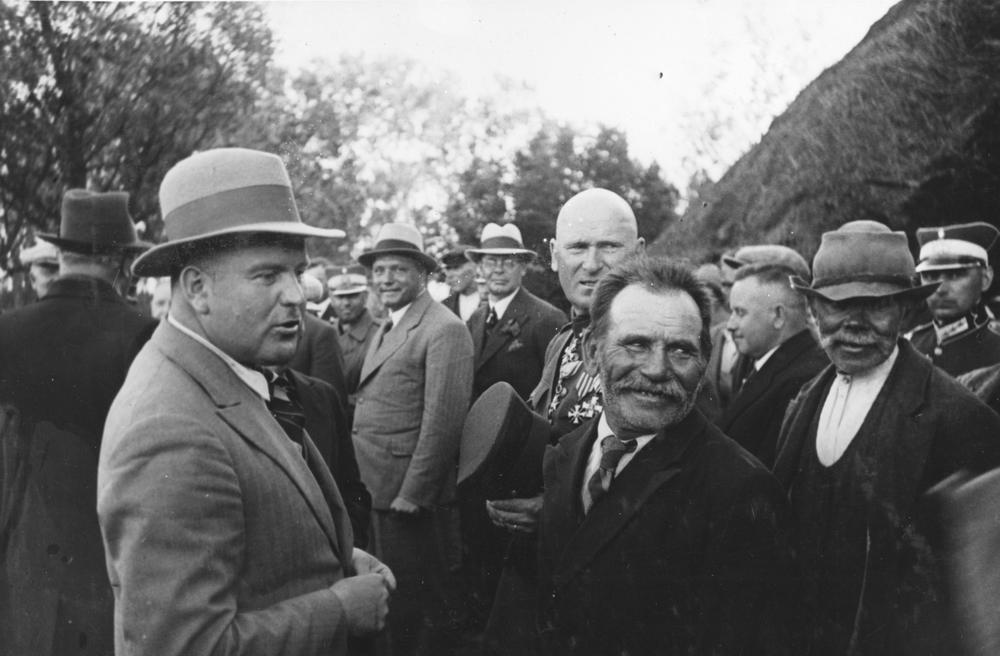 Latvijas Valsts un Ministru prezidenta Kārļa Ulmaņa un valdības pārstāvju vizīte Liepājā, par godu Latvijas Pagaidu valdības ierašanās 18. gadadienai. Valdības pārstāvju ceļojums pa Kurzemes jūrmalu - viesu sagaidīšana kādā Nidas ciema zvejnieka saimniecībā. Zemkopības ministrs Jānis Birznieks (priekšplānā no kreisās) sarunājas ar vietējiem iedzīvotājiem. 2. rindā no kreisās: 1. Kurzemes divīzijas komandieris, ģenerālis Oskars Dankers, 2. Liepājas pilsētas mērs, Aizputes baptistu draudzes mācītājs Evalds Rimbenieks (arī Ēvalds Rimbenieks). Fonā (centrā) no kreisās 2. iekšlietu ministrs Vilis Gulbis.