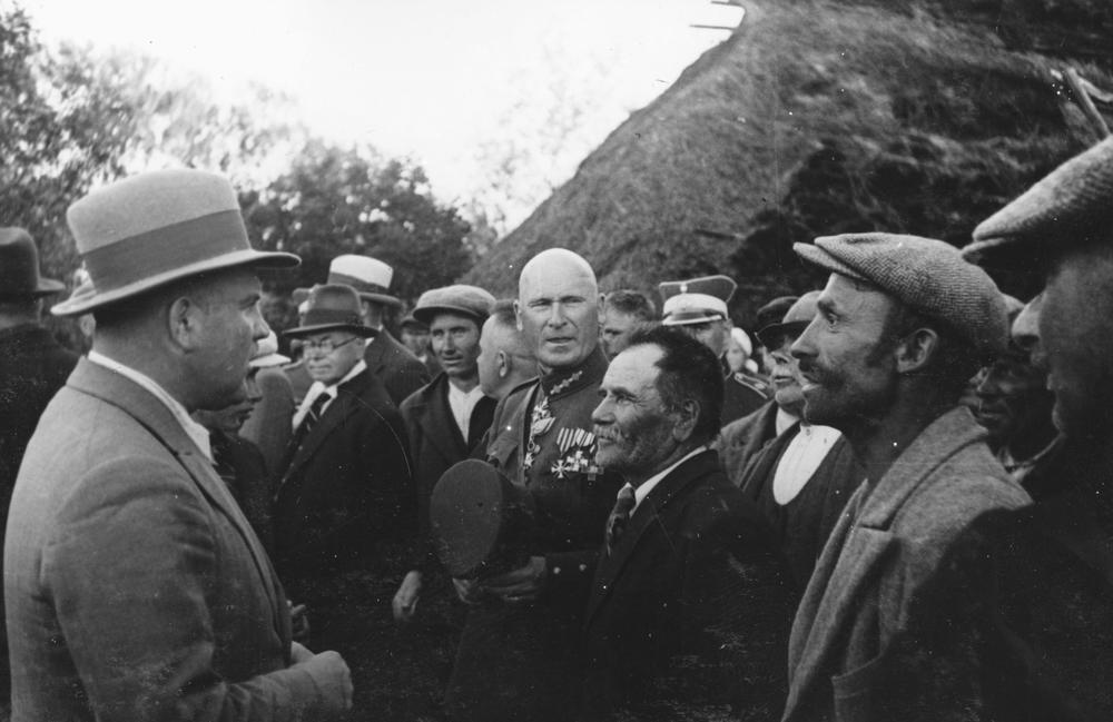 Latvijas Valsts un Ministru prezidenta Kārļa Ulmaņa un valdības pārstāvju vizīte Liepājā, par godu Latvijas Pagaidu valdības ierašanās 18. gadadienai. Valdības pārstāvju ceļojums pa Kurzemes jūrmalu - viesu sagaidīšana kādā Nidas ciema zvejnieka saimniecībā. Zemkopības ministrs Jānis Birznieks (priekšplānā no kreisās) sarunājas ar vietējiem iedzīvotājiem. fonā centrā no kreisās: 1. Valsts kancelejas direktors Dāvids Rudzītis, 4. Kurzemes divīzijas komandieris, ģenerālis Oskars Dankers.